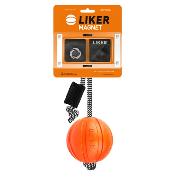 Является превосходным тренировочным снарядом для развития концентрации внимания и послушания вашей собаки. При помощи двух мощных магнитов на одежде дрессировщика создается узел крепления для мяча, также оснащенного магнитом. Крепление мяча надежно, поэтому он не сможет упасть самостоятельно. Легко забрасывается на большое расстояние. Уникальный материал из которого сделан лайкер - не токсичный, прокусываемый и не ранит дёсна собаки. Мячиком невозможно пораниться, так как материал хоть и упругий, но мягкий. При попадении внутрь полости рта, зубы собаки очищаются. Загрязненный мячик легко отмывается. На этом материале грязь не задерживается, а значит, и бактерии не попадут в пасть собаки.