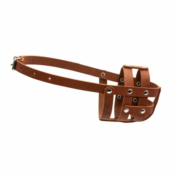 Высококачественный кожаный закрытый намордник с продуманным дизайном и украшениями в виде заклепок, благодаря ему питомец не сможет подобрать какой-либо мусор или укусить.