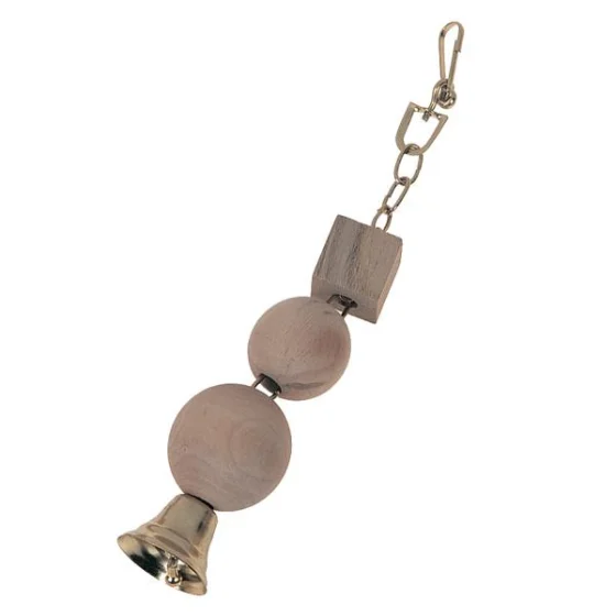 Игрушка для попугаев Flamingo в виде деревянных блоков с колокольчиком – прочный и развивающий аксессуар для волнистых попугаев и мелких декоративных птиц. Цепочка с деревянными блоками стимулирует активность и любопытство птицы, а металлический колокольчик издает мелодичный звук при контакте.