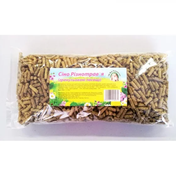 Мой Пушистик сено разнотравье гранулированное, 450 г — полезный и удобный корм для грызунов и кроликов. Гранулированная форма облегчает кормление и дозирование, а смесь луговых трав обеспечивает питомцев клетчаткой, витаминами и минералами для здоровья, правильного пищеварения и стачивания зубов.