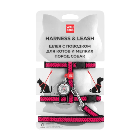 Шлея с поводком Waudog Nylon, для котов, с QR паспортом, рисунок Арбуз, 10 мм, 122 см, 20-30 см/25-40 см