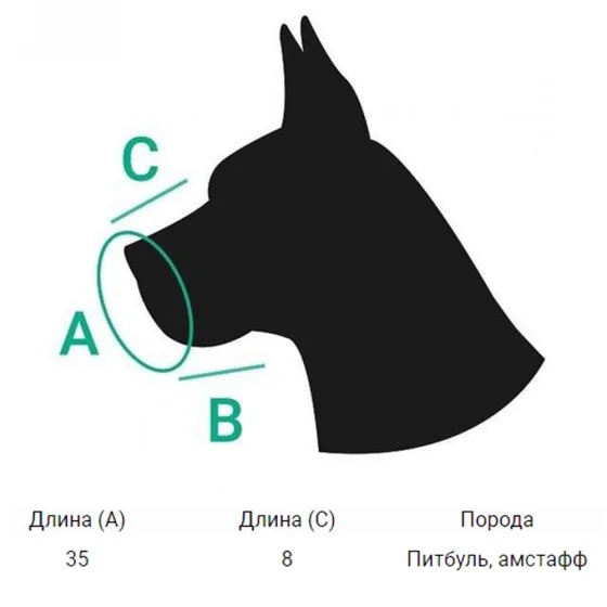 Намордник изготовлен для основных служебных и охотничьих пород собак, таких как немецкая овчарка (сука, кобель), бельгийская овчарка малинуа, доберман, сеттер, пит-буль, стаффордширский терьер и собак с идентичными формами и размерами морды.