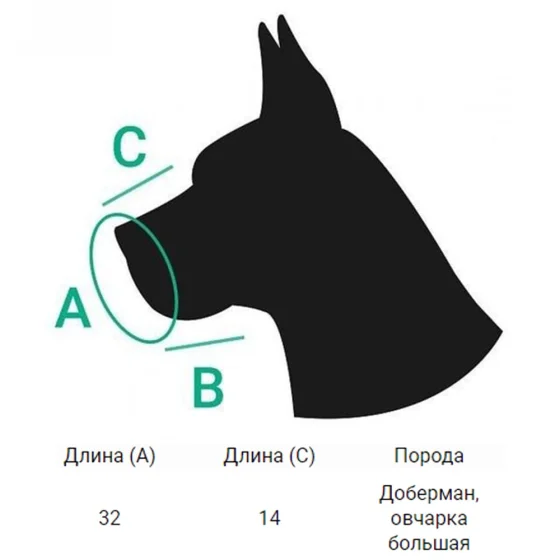 Намордник изготовлен для основных служебных и охотничьих пород собак, таких как немецкая овчарка (сука, кобель), бельгийская овчарка малинуа, доберман, сеттер, пит-буль, стаффордширский терьер и собак с идентичными формами и размерами морды.