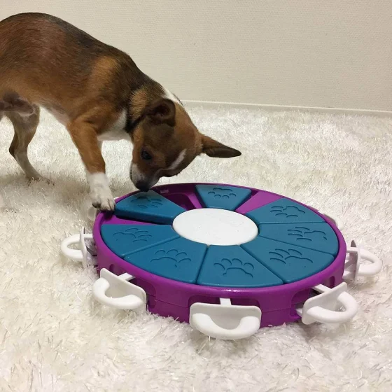КАК ИГРАТЬ: поместите лакомство в круглые отверстия колпачков и отделения в основе. Поверните крышечки, так, чтобы они закрывали отделения. Итак, начнем игру! Поместите игру на полу и поощрите питомца искать лакомство. Собаки умнее, чем мы думаем. Иногда им достаточно лишь то показать. Чтобы разжечь интерес питомца к игре, оставьте незаблокированными несколько косточек и открытыми несколько выдвижных ящиков.