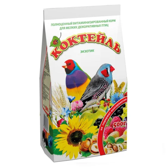 Конопляное семя полезно птицам в период гнездования, канареечное семя и семена льна и сафлора содержат необходимые для ярко окрашенных декоративных птиц микроэлементы, использование в рецептуре витаминов и минеральных веществ позволяет применять «Экзотик» для молодых птиц, а также в период линьки. Не забывайте добавлять в рацион Вашего любимца лакомство «Коктейль».