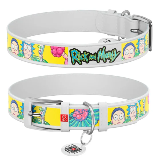 Ошейник Waudog Design с QR-паспортом для собак, кожаный, рисунок "Рик и Морти 1", S, 15 мм/27-36 см, белый