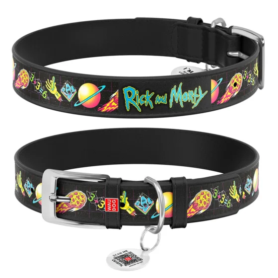 Ошейник Waudog Design с QR-паспортом для собак, кожаный, рисунок "Рик и Морти 3", M, 20 мм/30-39 см, чёрный