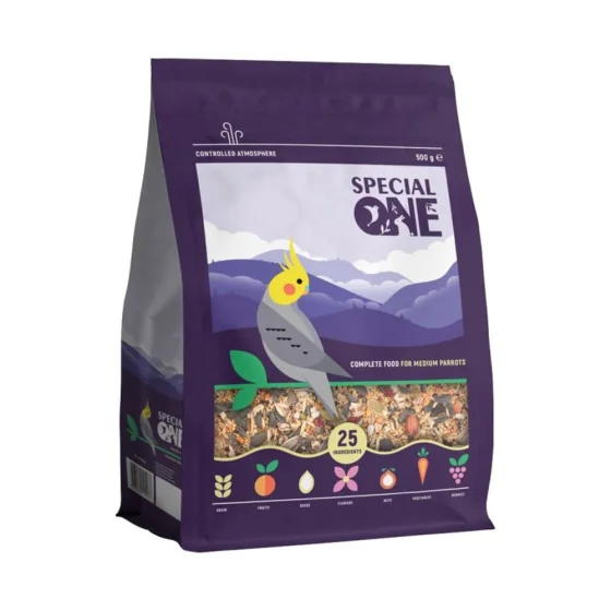 Корм имеет уникальный состав, в который включены отборное зерно и семена, другие продукты из природного ареала обитания средних попугаев. В состав корма вошло 25 ингредиентов, среди которых высококачественное зерно, сушеные фрукты, овощи и ягоды, орехи, а также любимые деликатесы - абиссинский нуг, маш, полба, эспарцет. Корм обогащен ингредиентами, которые укрепляют здоровье, делают оперение ярким и ускоряют линьку.