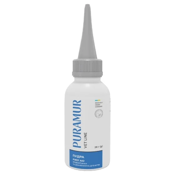 Пудрая Puramur First Aid предназначена для быстрой остановки небольшого капиллярного кровотечения в процессе стрижки когтей питомца, а также для обработки мелких капиллярных порезов у собак, кошек и других мелких животных.