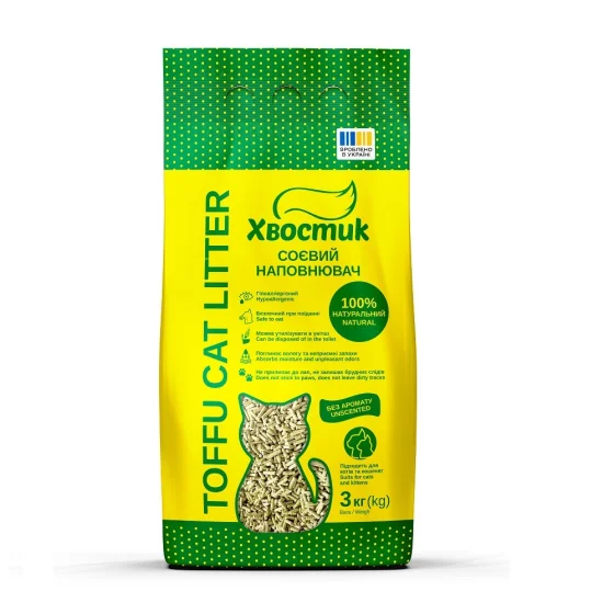 Соевый наполнитель ТМ Хвостик изготовлен из натурального сырья. Обладает высокими поглощающими свойствами, нейтрализует запахи. Наполнитель подходит для кошек и котят с самого раннего возраста. Благодаря своей натуральности не вызывает аллергии и безопасен для поедания. Наполнитель можно смывать в унитазе. При использовании не прилипает к лапам и не оставляет грязных следов.