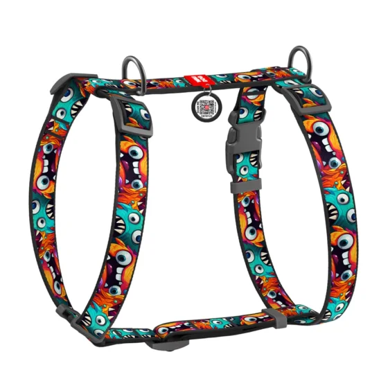 Шлея анатомическая H-образная Waudog Nylon для собак с QR-паспортом, рисунок "Зубастые монстры", М, Ш 20 мм, А 40-70, В 50-80