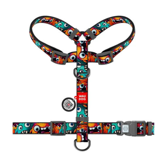 Шлея анатомическая H-образная Waudog Nylon для собак с QR-паспортом, рисунок "Зубастые монстры", L, Ш 25 мм, А 50-90 см, В 60-100 см