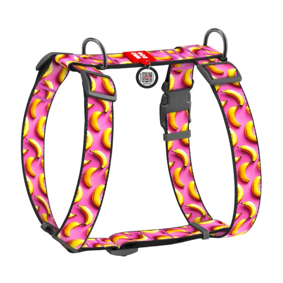 Шлея анатомическая H-образная Waudog Nylon для собак с QR-паспортом, рисунок "Бананы на розовом", XL, Ш 35 мм, А 55-95 см, В 70-110 см
