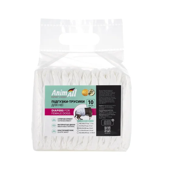 Одноразовый подгузник для собак AnimAll подходит как для щенков, так и для взрослых собак любой породы и пола. Данный подгузник поможет обеспечить чистоту в доме, а также комфорт вашего песика в таких неудобных ситуациях, как недержание мочи, послеоперационный период, приучение щенка к туалету, в период течки и/или во время путешествий.