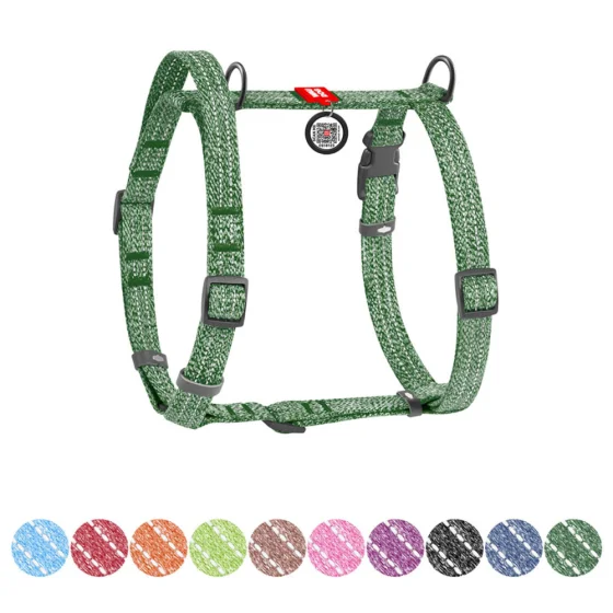 Шлея изготовлен из восстановленного хлопка, что делает его экологически чистым и износостойким. Гипоаллергенный материал обеспечивает комфорт для пушистого любимца, а вплетенная светоотражающая нить гарантирует безопасность во время прогулок в темное время суток. Шлея разработан таким образом, что при натяжении поводка не происходит сжатия дыхательных путей. животные. Имеет 2 полукольца для поводка (верхнее и нижнее), что позволяет более равномерно распределить физическое. погрузка на опорно-двигательный аппарат собаки.