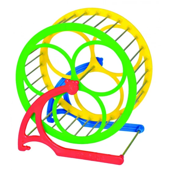 Это не только развлечение, но и возможность поддерживать мышцы в тонусе. нормализовать обмен веществ, удовлетворить естественную потребность в движении. Яркое колесо на стойкой подставке изготовлено из качественной пластмассы, не содержащей токсичных или опасных для животных веществ. Поперечины сделаны из прочного проволоки. Аксессуар легко моется, прост в уходе и придаст интерьеру клетки. праздничный вид. По желанию колесо можно установить вне клетки, но не следует оставлять в нем зверька без присмотра.