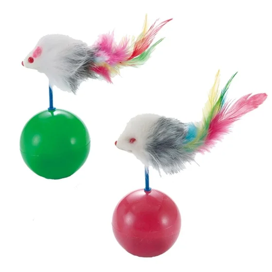 Игрушка для кошек CattyMan МИША НЕВАЛЯЙКА — отличный партнер для охоты и кошачьих игр. Для стимуляции охотничьего инстинкта и разжигания азарта игры предусмотрено почти все. Прекрасная мышка изготовлена из натурального кроличьего меха. У нее шикарный яркий хвост из натурального пера, не совсем, конечно, мышиный, но вашему коту обязательно понравится. Мышь закреплена на небольшой пластиковой жердочке, которая неподвижно соединена с шаром.