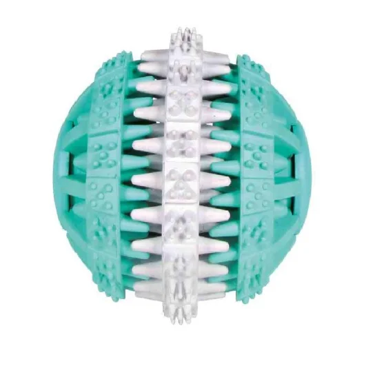 Масажний м'яч з шипами Trixie з м'ятою призначений для активних ігор та догляду за зубами й яснами вашого собаки. Шипована поверхня масажує ясна та допомагає видаляти наліт, забезпечуючи корисну гру.