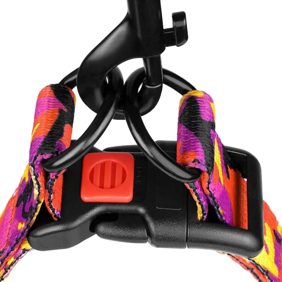 Високоміцний нейлон, з якого виготовлена шлея, не втрачає колір при пранні і не вигорає на сонці. Шлея укомплектована високоякісної пластикової пряжкою. Обхват регулюється. Виріб м'яке на дотик, гнучке і не боїться води. Вона практична і невибаглива в догляді.