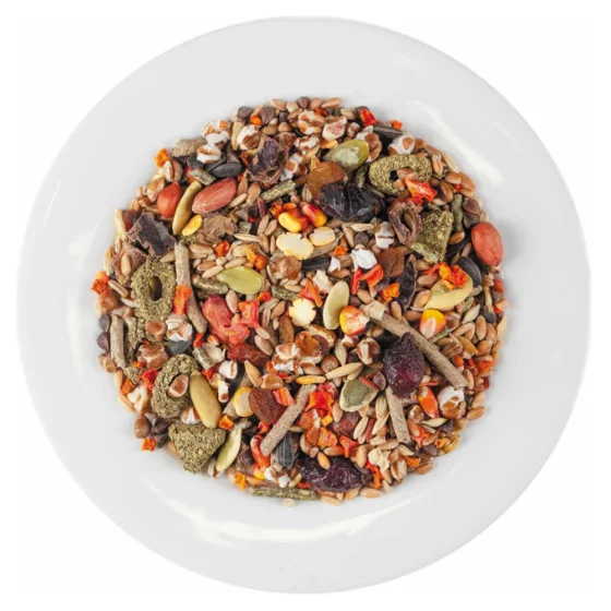 У складі раціону – 21 інгредієнт, у тому числі насіння, цілющі трави, сушені фрукти, овочі, а також улюблені делікатеси – арахіс, шипшина, червоний рис, насіння гарбуза. До складу корму включені інгредієнти, які задовольняють потребу організму в білках, мінеральних речовинах, зміцнюють кістки та м'язи, покращують зовнішній вигляд тварин.