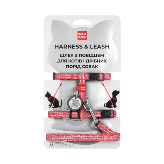Шлея з повідцем світловідбиваючі WAUDOG Re-cotton для котів, з QR паспортом, бавовна, XS, червоний