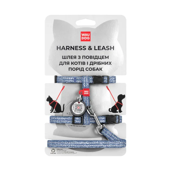 Шлея з повідцем світловідбиваючі WAUDOG Re-cotton для котів, з QR паспортом, бавовна, XS, синій