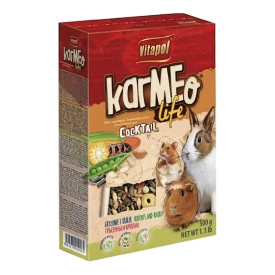 Vitapol Коктейль KARMEO LIFE для гризунів і кроликів – додаткова кормова суміш для гризунів та кроликів. Суміш включає вітамінізовані гранули, моркву, гарбузове насіння, ріжкове дерево і арахіс. Горіхи багаті вітаміном Е, який захищає нервову та імунну систему, а також є чудовим антиоксидантом. Ріжкове дерево також містить багато вітамінів, таких як A, B2, B3, D, E, а також мінеральні солі: кальцій, фосфор, калій, магній, залізо. Він позитивно впливає на травну систему і сприяє зниженню рівня холестерину в крові.